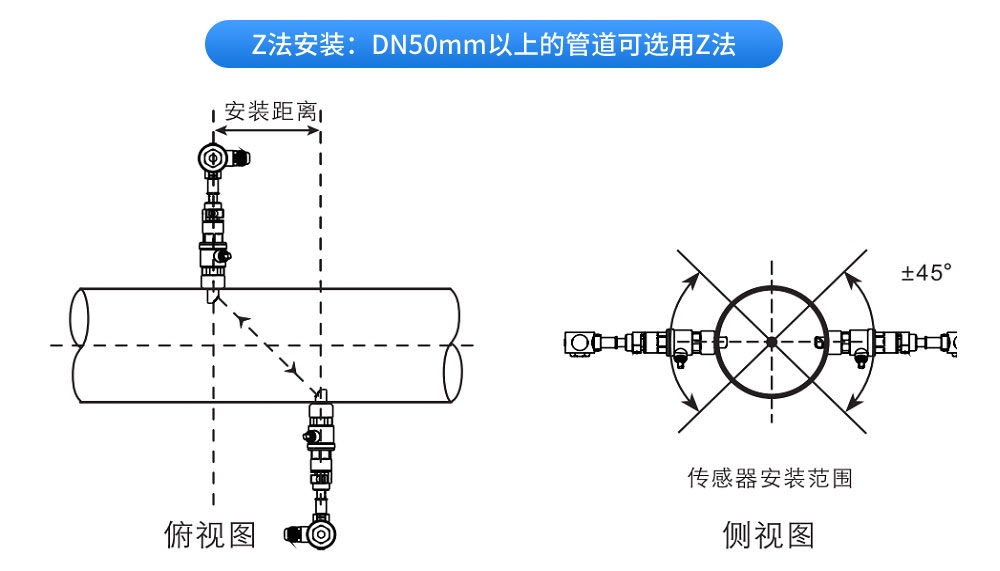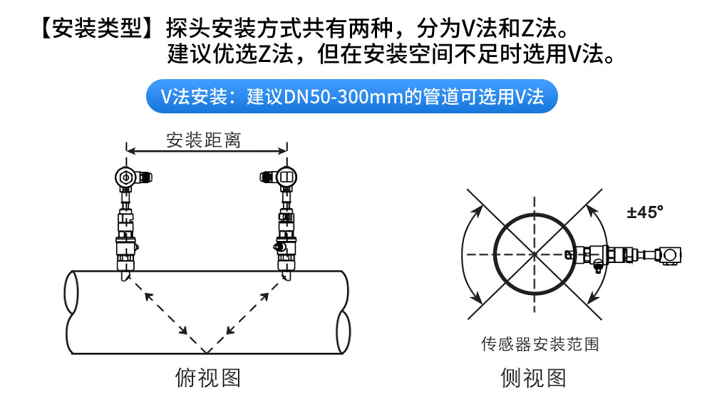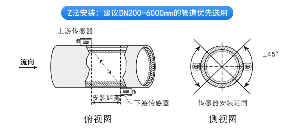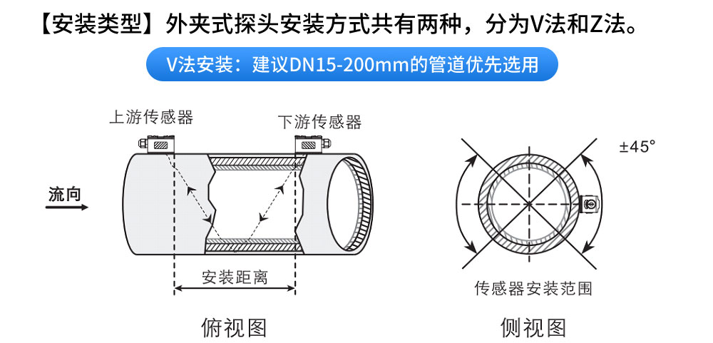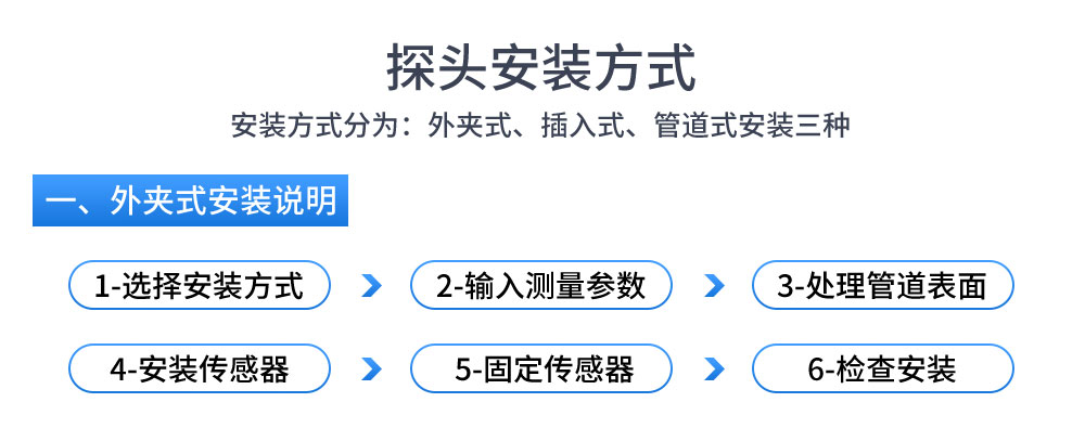 外夾壁掛式超聲波流量計(jì)利用了低電壓,多脈沖時(shí)差原理,采用高精度和超穩(wěn)定的雙平衡信號(hào)差分發(fā)射、差分接收數(shù)字檢測技術(shù)來測量順流和逆流方向的聲波傳輸時(shí)間,根據(jù)時(shí)差計(jì)算出流速。