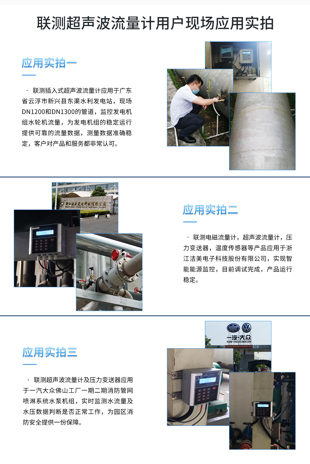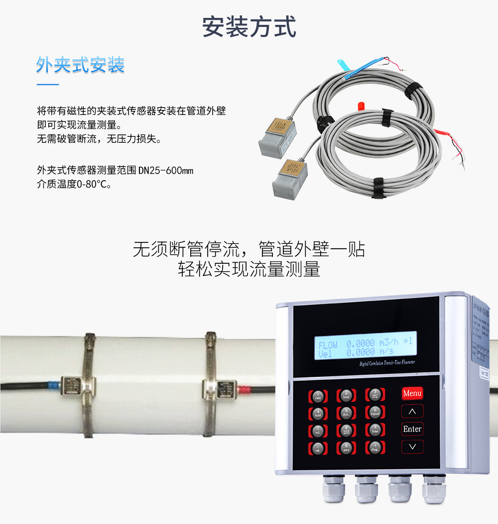 聯測超聲波流量計適合相對純凈液體流量的管外測量,尤其是在水流量測量、在工業循環水、空調制冷循環水、原水、高壓水、自來水,污水排放管等廣泛應用。