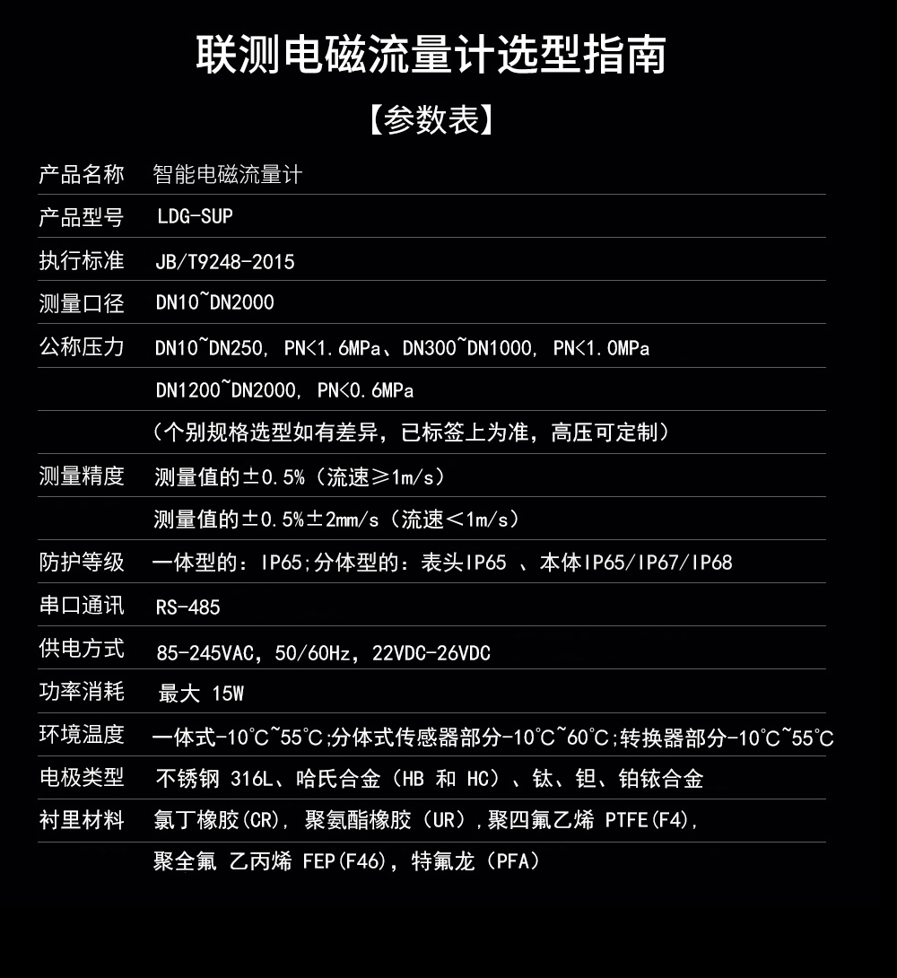 聯測儀表LDG-SIN大口徑電磁流量計適用于污水、自來水等簡單介質或對測量穩定性要求不高的場合,可配485通訊功能,目前配置有電極:316L,襯里:氯丁橡膠與聚四氟乙烯等。