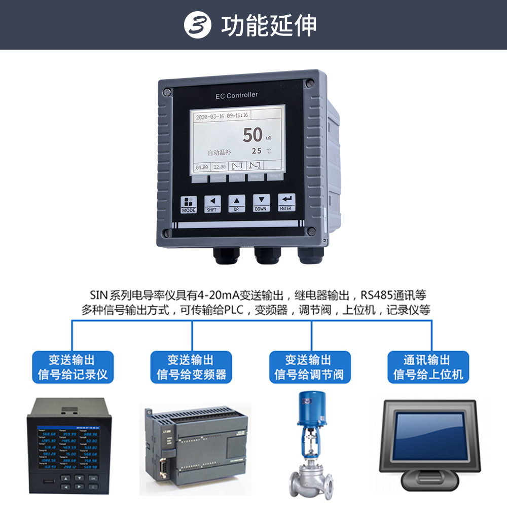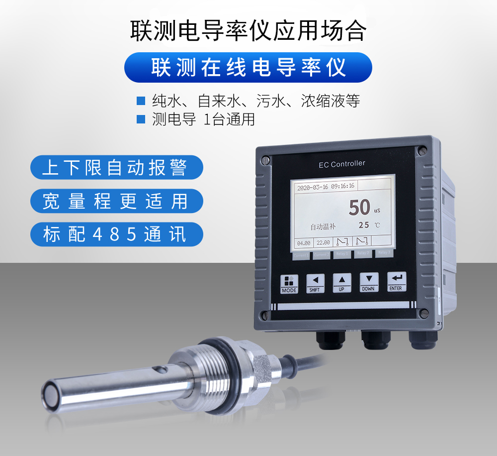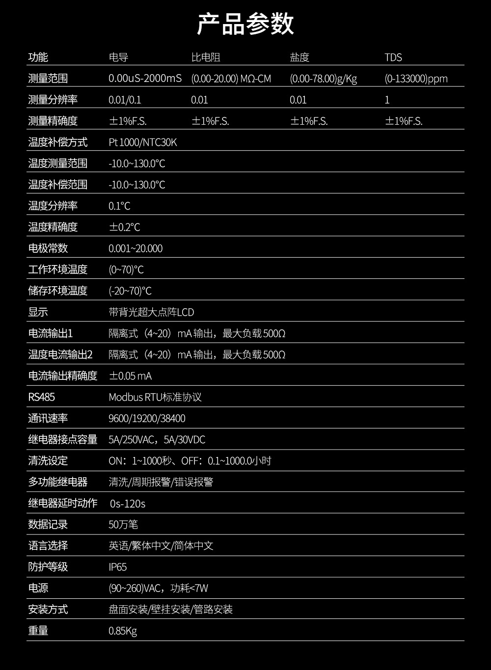 儀器用于工業上電導/比電阻/鹽度/溶解固體總量及溫度的測量,如: 廢水,純凈水,環境監測,食品生產過程等,儀器可以盤面安 裝,壁掛安裝,管路安裝。儀器提供 2 路電流輸出,最大負載為 500Ω, 儀器提供 3 路控制用繼電器,繼電器最大承受電壓及電流為 5A/250VAC 或 5A/30VDC。