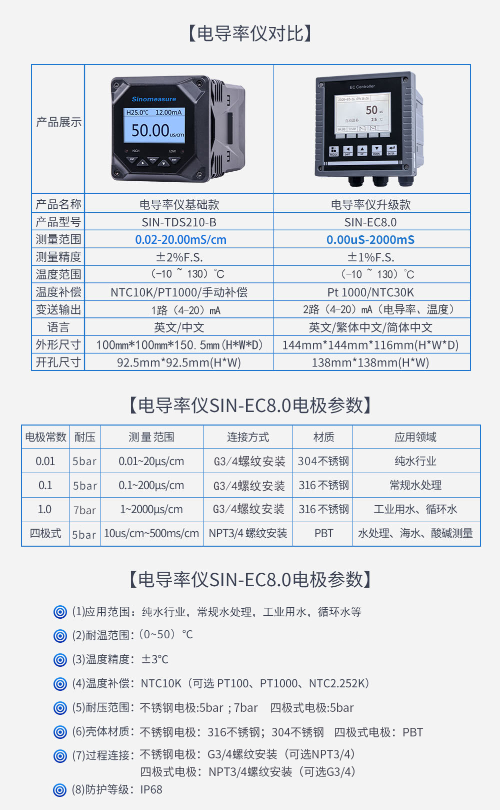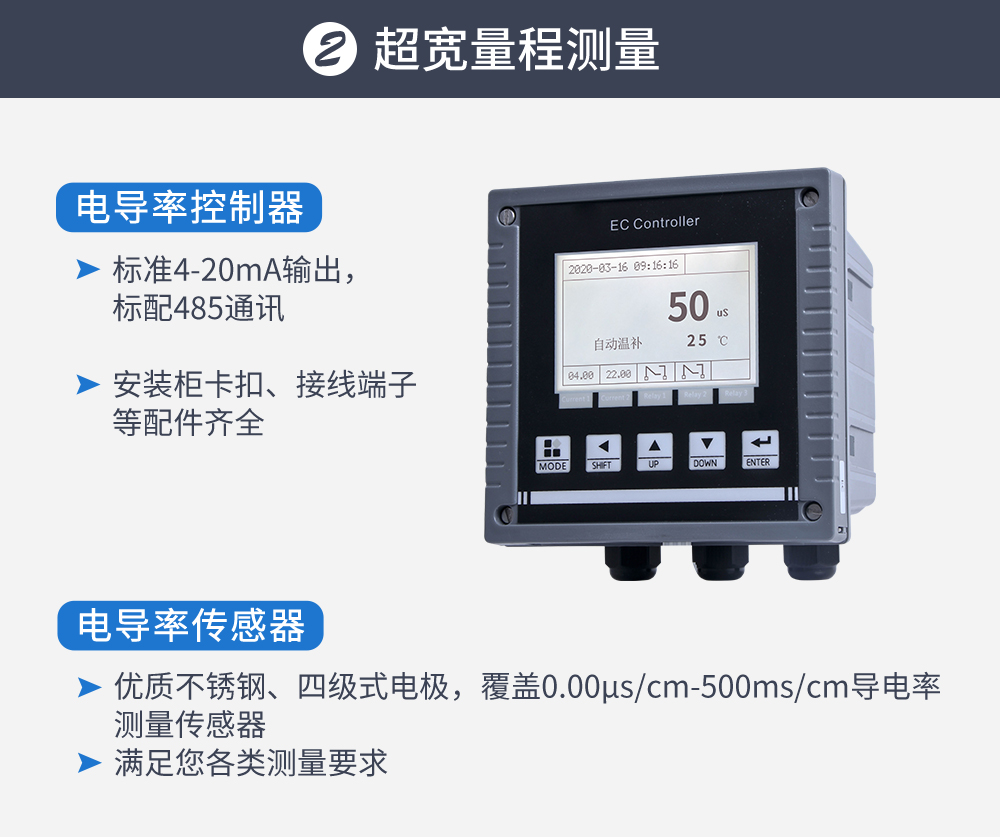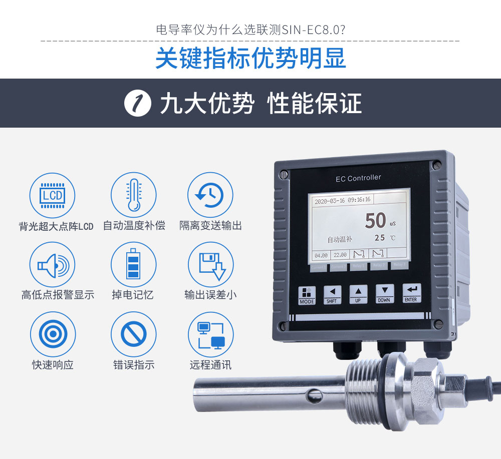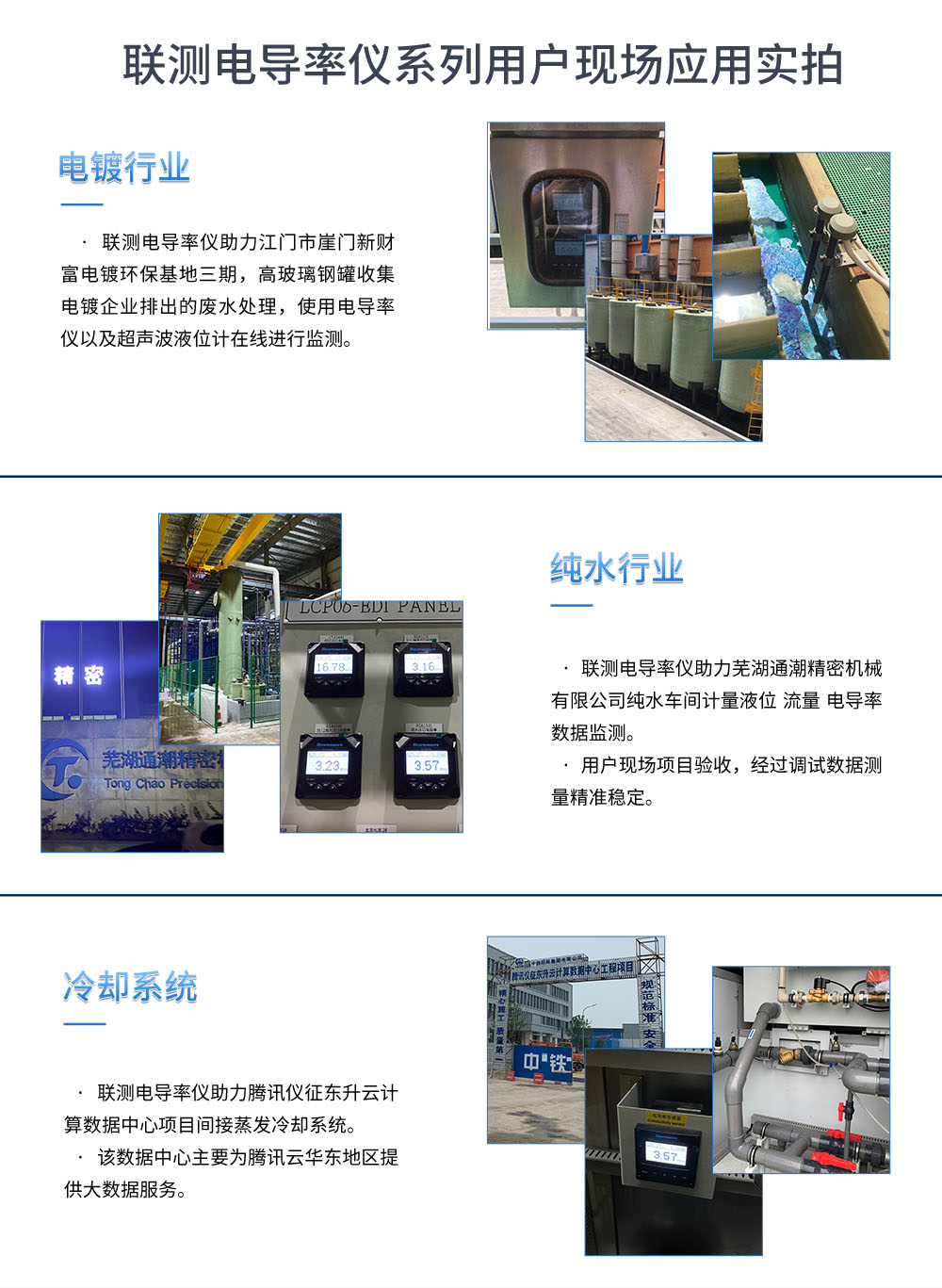 儀器用于工業上電導/比電阻/鹽度/溶解固體總量及溫度的測量,如: 廢水,純凈水,環境監測,食品生產過程等,儀器可以盤面安 裝,壁掛安裝,管路安裝。儀器提供 2 路電流輸出,最大負載為 500Ω, 儀器提供 3 路控制用繼電器,繼電器最大承受電壓及電流為 5A/250VAC 或 5A/30VDC。